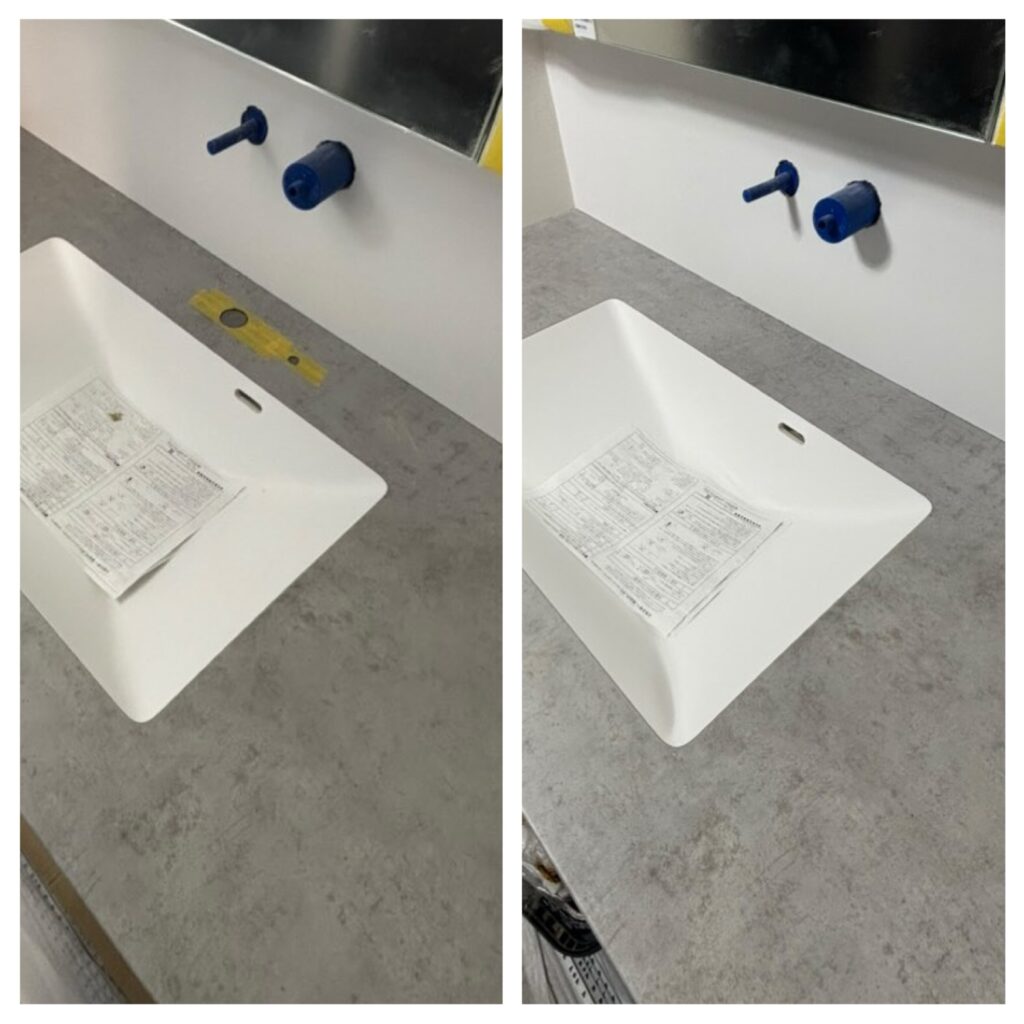 洗面台 水栓位置変更による穴あき部補修