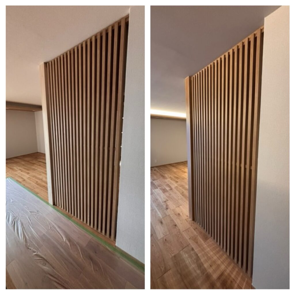 新築物件、リビングルームの格子の色に寄せた 白木染色塗装しました。